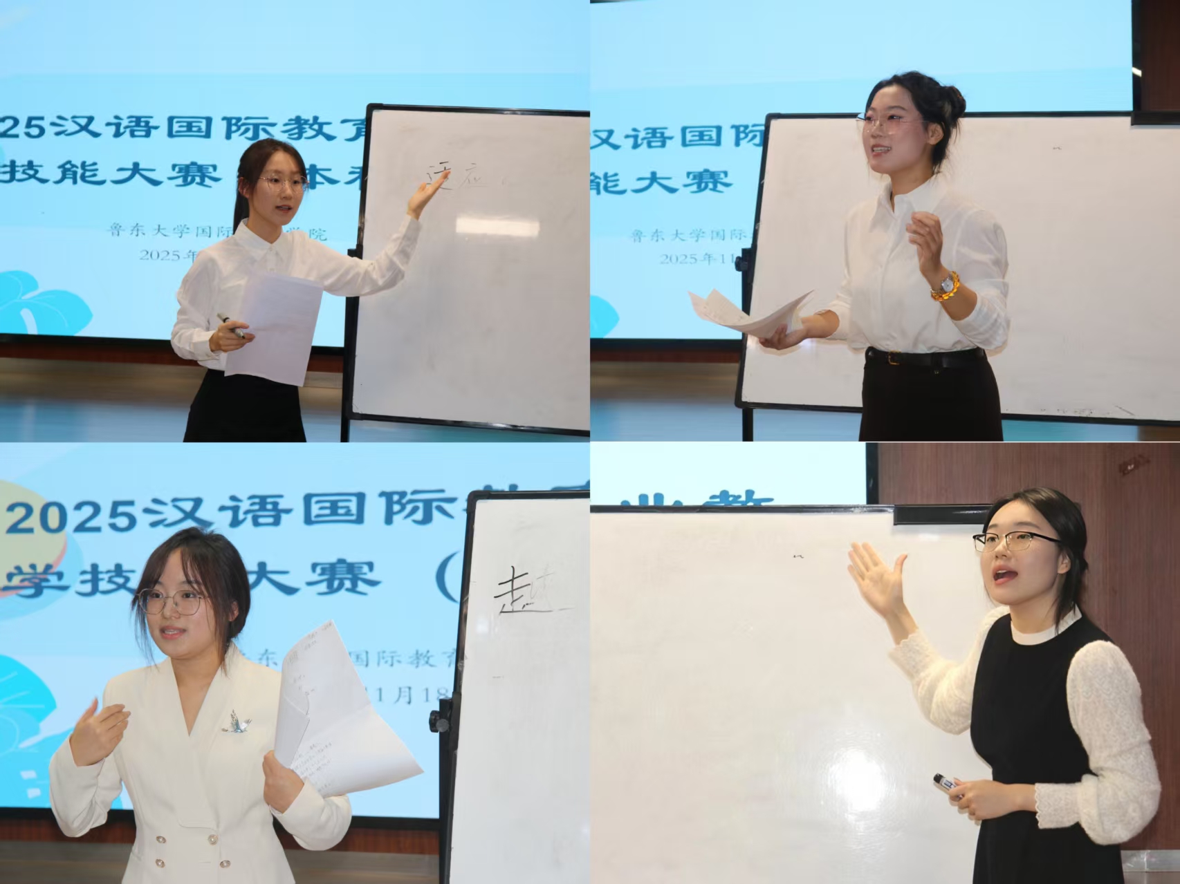 本次比赛设初赛、决赛两个阶段。初赛于11月11日下午分组进行,参赛选手在导师的指导下,从教学设计、课件制作、课堂互动等方面进行了精心准备。比赛中,中外学生全面展示了自身的专业能力。选手们个个精神饱满、仪态大方,既能用清晰的教学思路把知识点讲得条理分明,又靠新颖的教学设计让课堂内容鲜活起来。不少参赛者的互动环节使教学过程充满了吸引力,其中国际生也在比赛中展现出了扎实的汉语教学基本功,巧妙融入了中国传统文化元素,让比赛精彩纷呈。经过一番激烈角逐,20位本科生表现突出,成功晋级决赛。